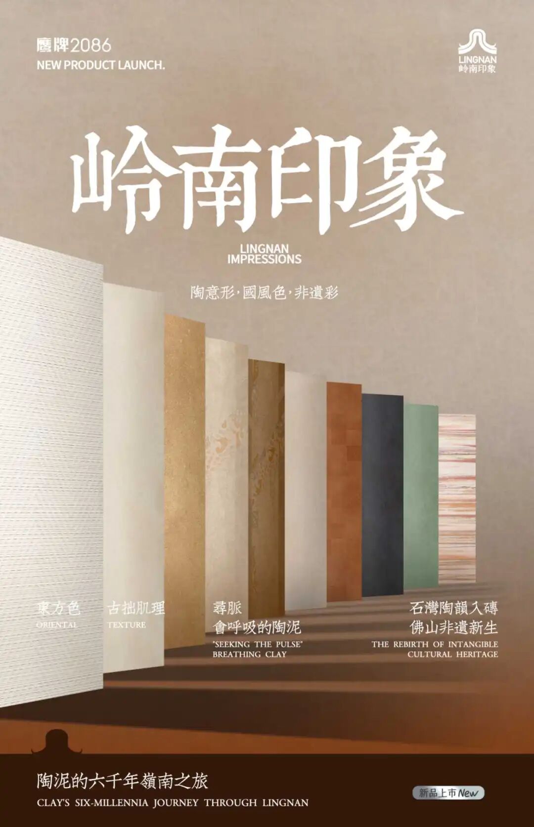鹰牌2086继水墨京砖、意象青花系列之后,再次隆重推出的东方文化IP产品——岭南印象系列,其以石湾陶为肌底,融合佛山非遗文化图腾和中国传统色,打造兼具东方文化与岭南气质的空间美学材料。