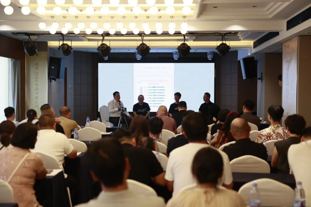 随着现场气氛渐入高潮,岭南印象VI正式发布,鹰牌2086营销中心副总经理朱文强、鹰牌2086华东区总监黄伟杰、鹰牌2086市场部经理李伟东,鹰牌2086长沙经销商代表蔡志芳、周胜福5位领导共同上台按下手印,这一动作不仅标志着鹰牌2086在东方文化IP产品序列上的进一步深化,也体现出品牌对传统文化现代转译的持续探索。