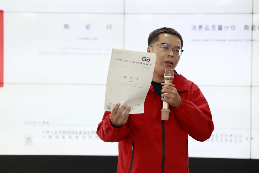 会议上半场,培训核心聚焦于国家最新颁布的《消费品质量分级 陶瓷砖》标准,质量管理中心-质量工程师陈壬庚从政策背景、分级标准、技术指标、检测方法等多个维度,进行了全面而深入的解读。