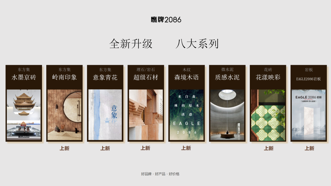 2025年,鹰牌2086将整个产品体系分为八大系列,“水墨京砖”、“意象青花”、“岭南印象”三大东方集IP产品系列,森境木语系列、质感水泥系列、 超级石材系列、花漾映彩系列、EAGLE2086岩板系列。